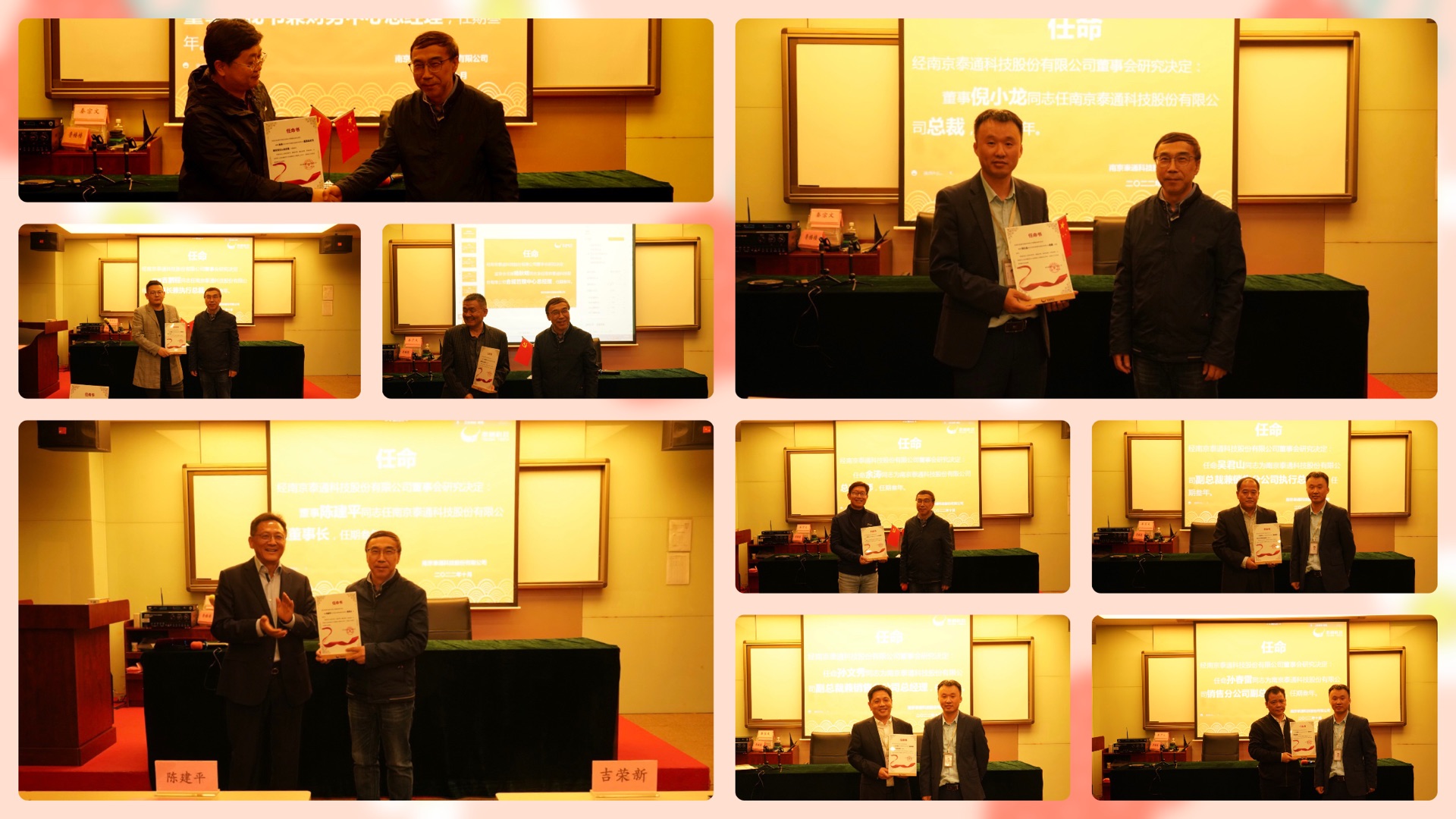 泰通科創(chuàng)始人吉榮新向泰通科技董事長陳建平頒發(fā)了董事長任命書。 陳建平董事長、倪小龍總裁向銷售分公司和公司各中心總經(jīng)理頒發(fā)了任命書。
