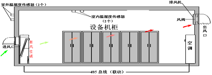工作原理:模塊新風(fēng)空調(diào)設(shè)備是結(jié)合新風(fēng)與空調(diào)控制,對機房進行熱功控制的系統(tǒng),當(dāng)室內(nèi)溫度達到22℃(可設(shè)置),室內(nèi)外溫度差△T≥2℃,模塊新風(fēng)設(shè)備開啟,向室內(nèi)送入過濾后的冷空氣,室內(nèi)溫度降至18 ℃時,模塊新風(fēng)停機;如室內(nèi)溫度繼續(xù)上升至25 ℃時,模塊新風(fēng)停機,模塊精密空調(diào)啟動制冷工作,室內(nèi)溫度降至23 ℃時,模塊精密空調(diào)停止工作,等待下一個工作流程,以此循環(huán)工作。